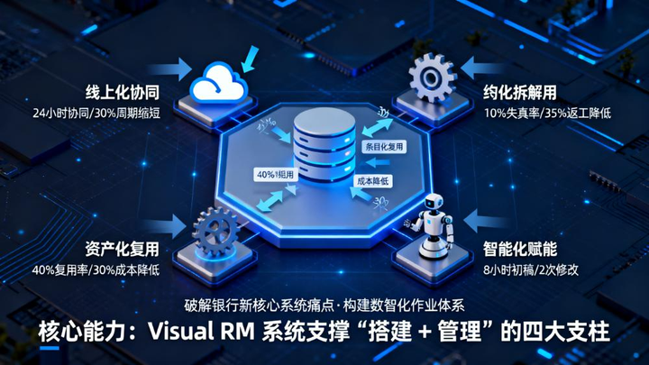 基于附件中系统功能与特性,Visual RM 需求数智化系统通过四大核心能力,精准破解银行新核心系统 “搭建 + 需求管理” 痛点,构建标准化、数智化的作业体系,具体能力如下: