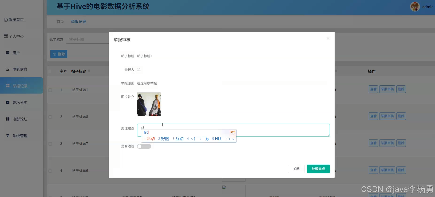 随着大数据技术的迅速发展,如何高效管理和分析海量的电影数据成为研究热点。本文设计并实现了一种基于Hive的电影数据分析系统,旨在通过分布式数据处理技术,对电影信息进行采集、存储、分析与展示。系统分为用户端和管理员端,用户端提供电影浏览、论坛交流、资讯阅读和AI智能推荐等功能,增强用户交互体验;管理员端则包括用户管理、内容管理、论坛管理及系统维护等模块,实现对系统的全面监控与管理。系统后端采用Hive进行大数据分析,提升了对用户行为数据和电影热度的统计效率。该系统不仅具备良好的可扩展性和实用性,还在电影推荐与用户行为研究方面具有一定的参考价值。