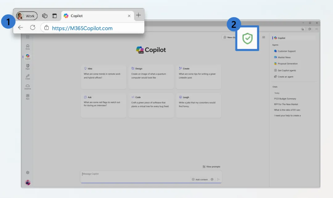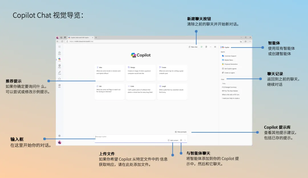 *想不出怎么写提示?输入框的 “View prompts”,就能看推荐示例;也可以访问aka.ms/Prompts,筛选行业相关提示、保存常用模板,还能和同事分享你的 “高效提示”。