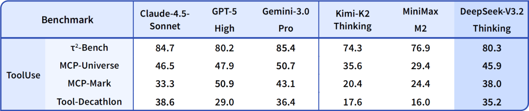在MCP-Universe和Tool-Decathlon等工具使用基准测试上,DeepSeek-V3.2也展现出了接近闭源模型的性能。