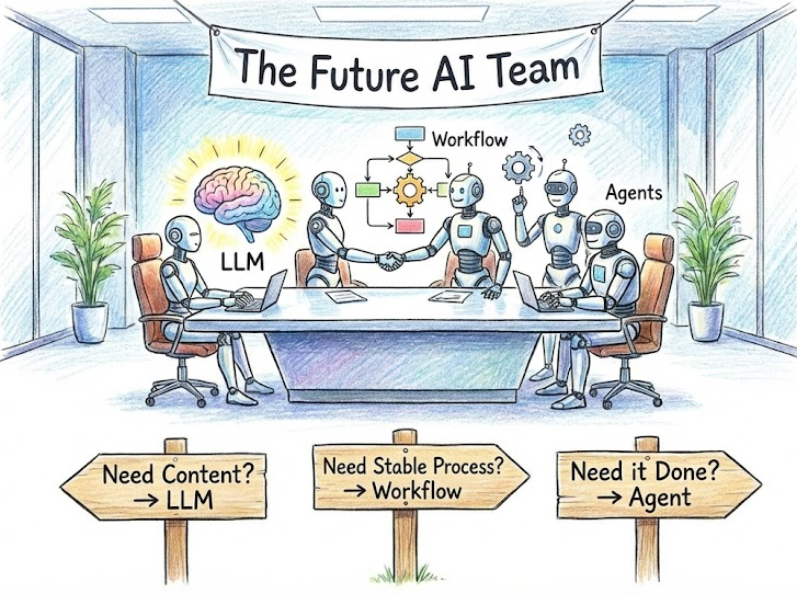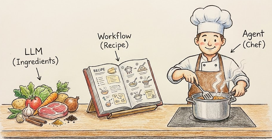 打个比方,就像做一道菜,只有食材(LLM),你做不出稳定的味道,有食谱(Workflow),食材才能被稳定利用,有厨师(Agent),才能面对突发状况灵活调整。