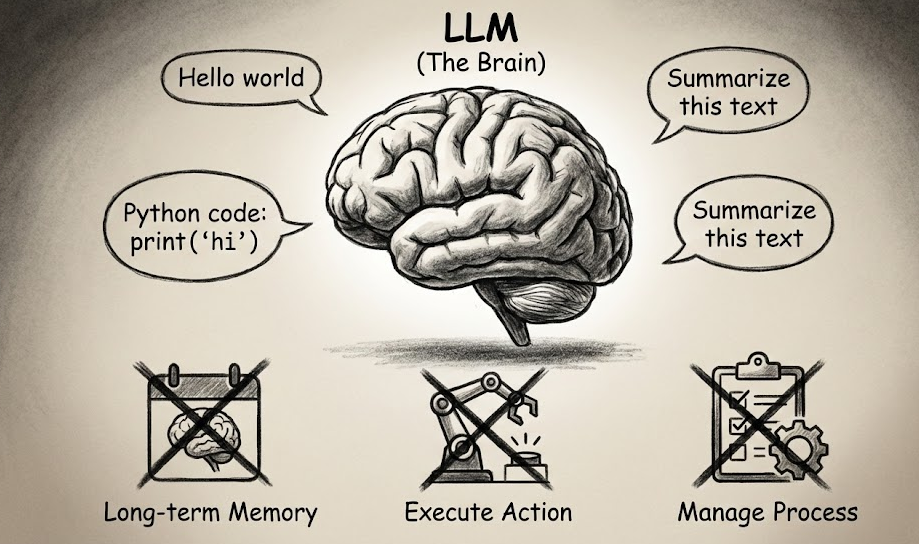 但是大语言模型也有自身的局限,它没有长期记忆,不能执行任务(无法真正“去搜集数据”“去发送邮件”),也不会管理流程(只负责回答,不负责“怎么组织步骤”)。