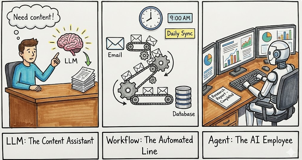 当你听说 “AI 自己写报告”“AI 自动做调研”“AI 当助理能独立完成任务”,那说的肯定不是llm,也不是workflow,而是agent。