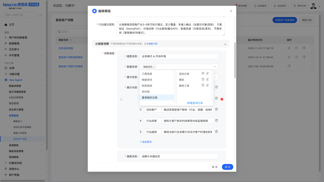 销售经理 Agent 通过整合工商、财务、新闻资讯、CRM 系统数据等内外部多源数据,AI自动总结并生成结构化客户全景报告,此前销售需要大半天的信息整理工作,现在AI可秒级自动完成。销售还可以设置客户洞察报告的刷新规则,不论是拜访客户前手动刷新,还是设置商机阶段变化时自动刷新,销售都能轻松获得最新鲜的综合业务情报,快速get 客户全貌,帮助销售将更多精力投入到客户沟通与需求挖掘。