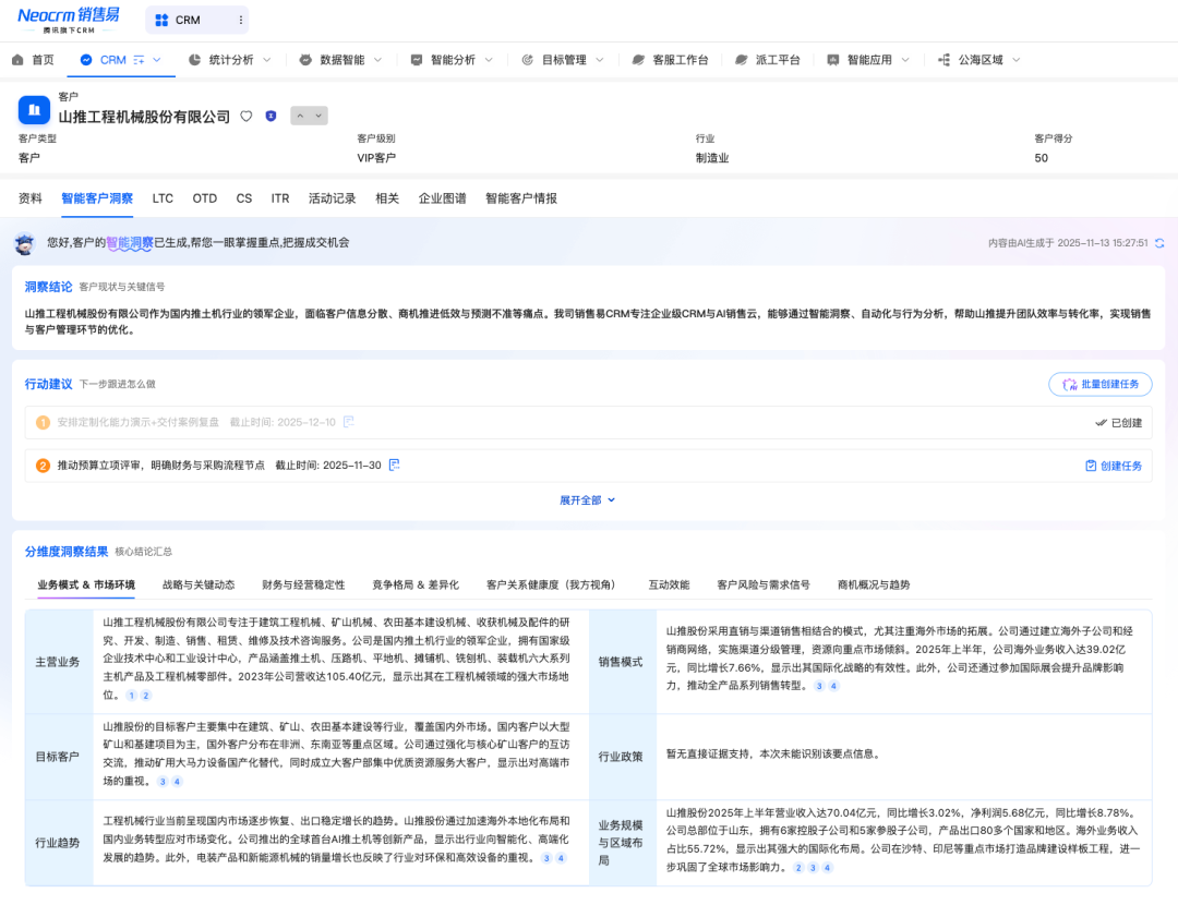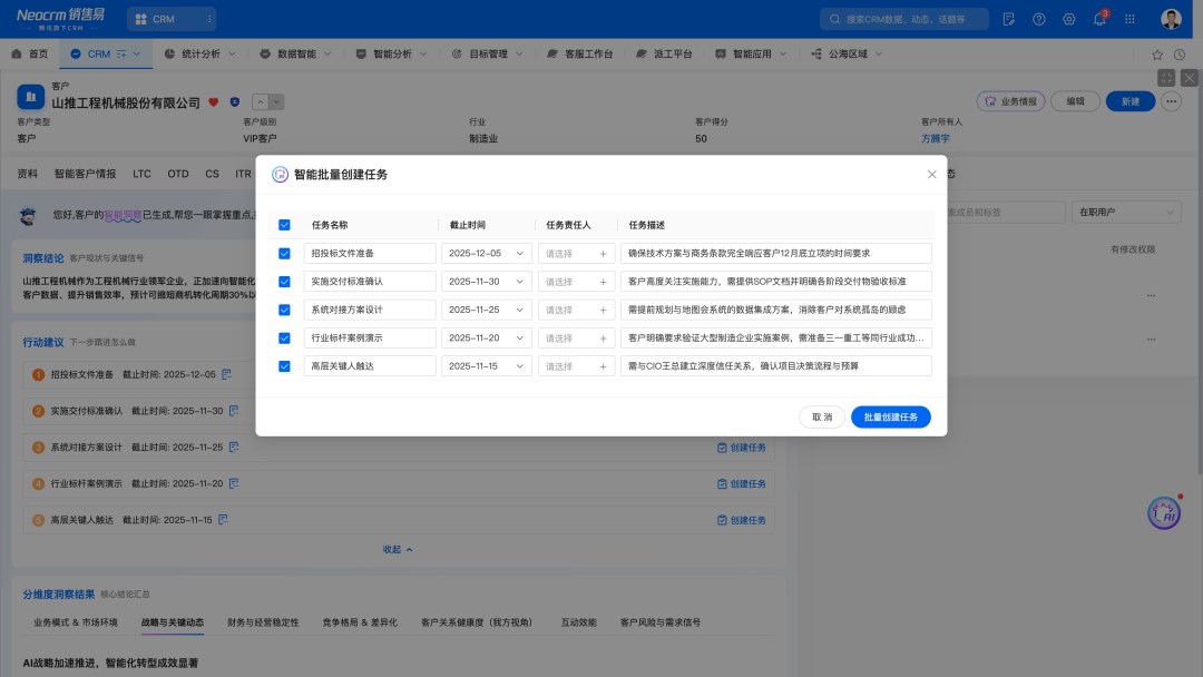 以往客户洞察后需快速落地执行关键动作,推进商机转化。传统流程中,**销售完成客户分析后,需手动规划后续动作,易出现行动滞后、任务遗漏等问题,**导致商机转化效率降低。