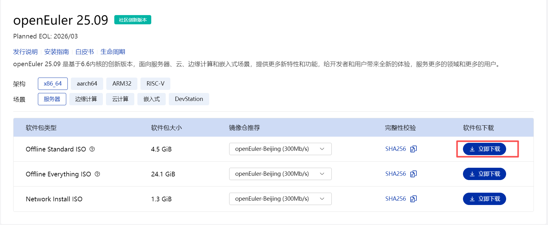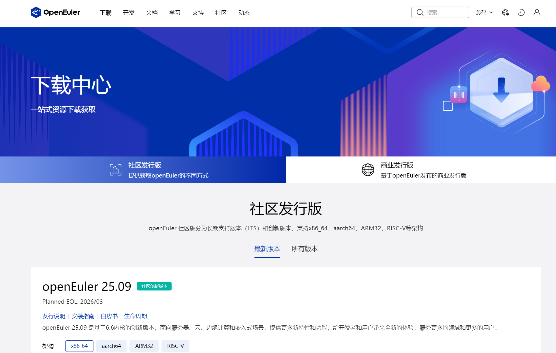 首先访问openEuler官网(https://www.openeuler.org/),在“下载”区域可以看到多个版本。我选择了**openEuler 25.09 LTS**版本,毕竟长期支持版更适合稳定使用。官方安装文档:安装准备 | 文档 | openEuler社区