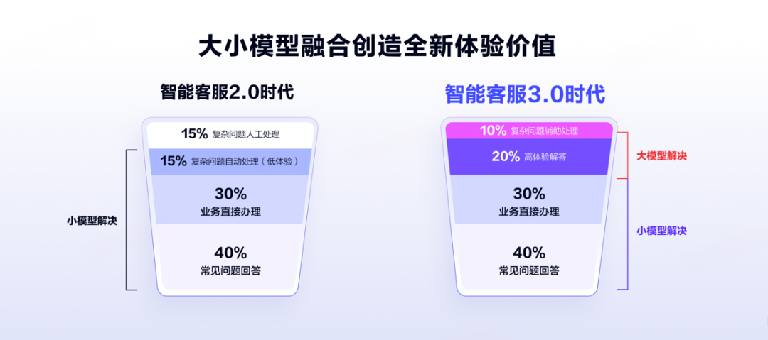 小模型解决40%的常见问题问答,以及协助办理30%的业务问题;而大模型则专注处理剩余20%能给用户带来高体验感的问题解答,以及辅助人工处理10%的复杂问题,实现了效率与体验的平衡。