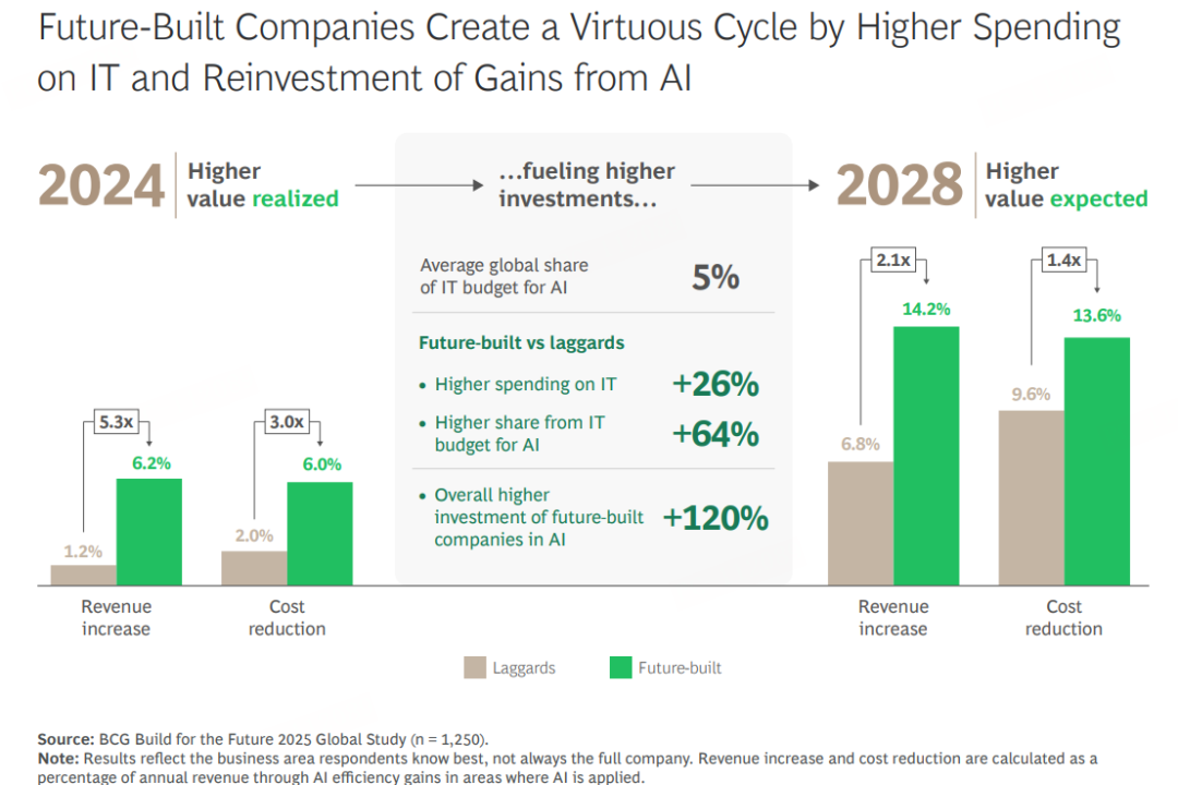 AI价值创造呈现出显著的“复利效应”,未来导向型企业已经形成了“高产出-高投入-更高产出”的良性循环。2025年,这些领先企业的IT投入比落后企业高出26%,其中AI专项投入占IT预算的比重达64%。