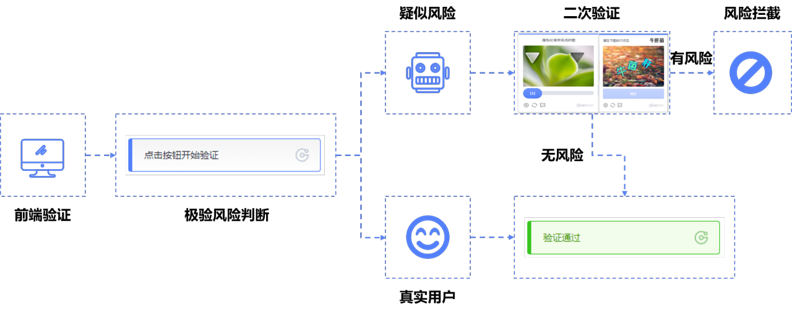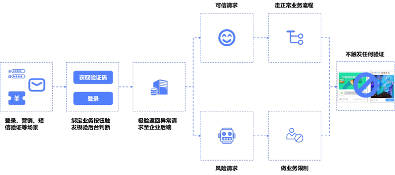 • 风控融合模式:支持与企业自有风控系统打通,由客户自行定义验证触发逻辑,实现更贴合业务的风险防控。