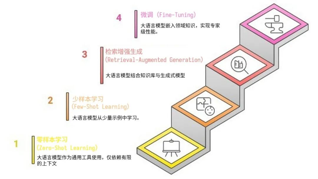 这个阶梯体现了 LLM 从 “通用工具” 到 “领域专家” 的能力升级路径 —— 越往上,模型的专业性、精准度越高。