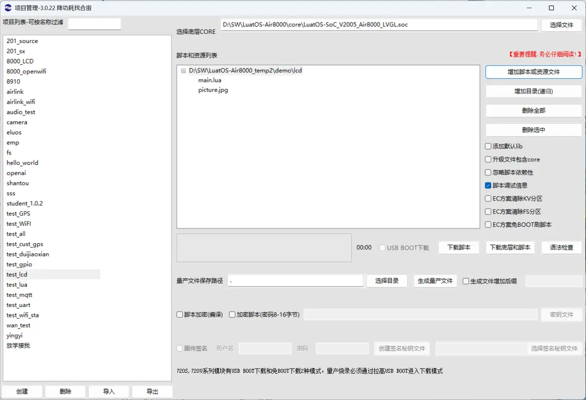 lib 脚本文件:使用 Luatools 烧录时,勾选 添加默认 lib 选项,使用默认 lib 脚本文件;