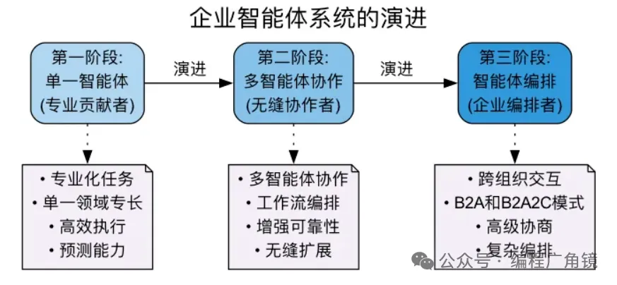 - Agentic 阶段:逐渐成为主流形态。它通过提供面向 Agent的 API,并内置多种通用的协作模式(Pattern),使开发者能够在 Agentic自主性 和 Predictability(可预测性)之间取得平衡,从而兼顾开发效率与执行准确性。