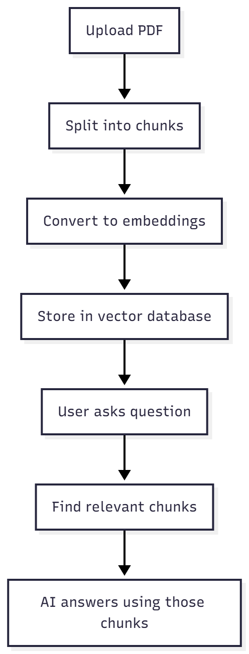 from langchain.document_loaders import PyPDFLoaderfrom langchain.text_splitter import RecursiveCharacterTextSplitterfrom langchain.vectorstores import FAISSfrom langchain.embeddings.openai import OpenAIEmbeddingsfrom langchain.chains import RetrievalQA# Load and process the PDFloader = PyPDFLoader("data/company_report.pdf")docs = loader.load()# Split into smaller chunkssplitter = RecursiveCharacterTextSplitter( chunk_size=1000, chunk_overlap=100)texts = splitter.split_documents(docs)# Create searchable databaseembeddings = OpenAIEmbeddings()vectorstore = FAISS.from_documents(texts, embeddings)# Create Q&A chainqa = RetrievalQA.from_chain_type( llm=llm, retriever=vectorstore.as_retriever())@app.post("/ask-doc")defask_document(question: str): answer = qa.run(question) return {"answer": answer}