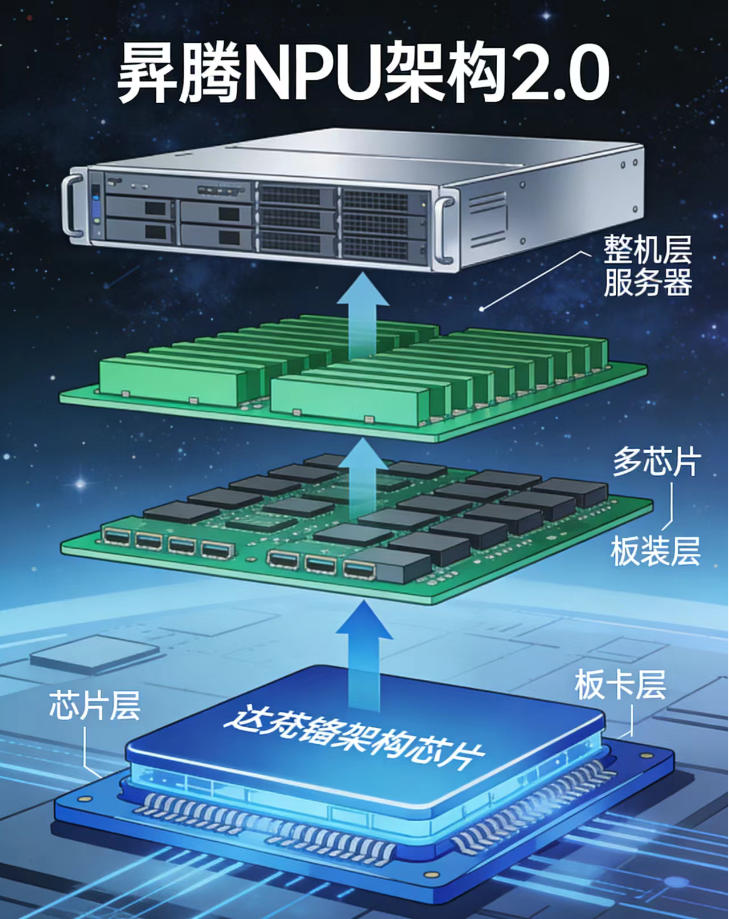 昇腾NPU的架构层次可概括为“芯片-板卡-整机”三级,其中芯片层的达芬奇架构提供基础算力,板卡层通过多芯片集成提升算力规模,整机层则通过集群技术实现超大规模算力扩展。其架构逻辑如下图所示