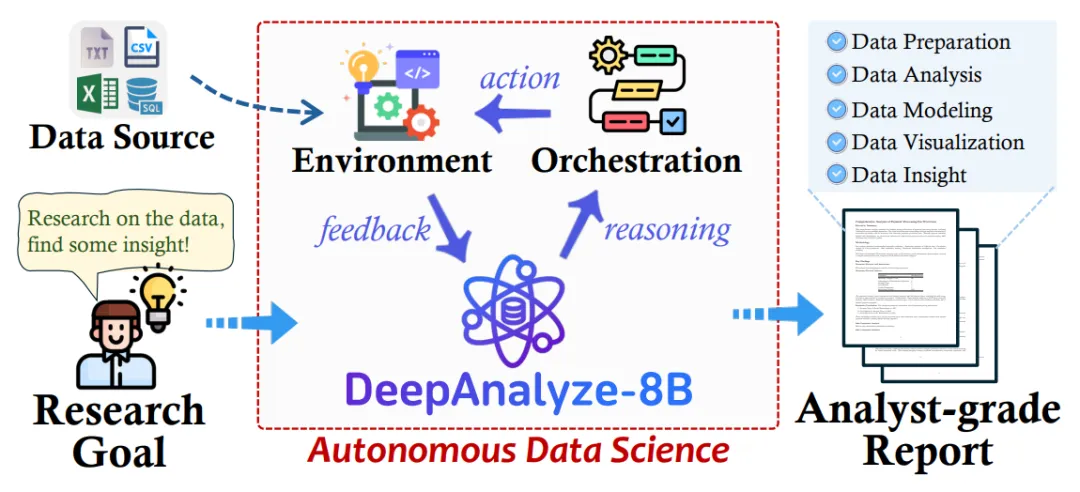 DeepAnalyze代表了自主数据科学领域的一次重大突破。它首次实现了从数据源到分析师级研究报告的完全自动化流程,不依赖任何预定义的工作流程或规则。这种能力源于研究团队提出的课程式智能体训练范式和数据驱动的轨迹合成框架,这两项创新共同解决了数据科学任务的高复杂性带来的奖励稀疏和轨迹稀缺问题。