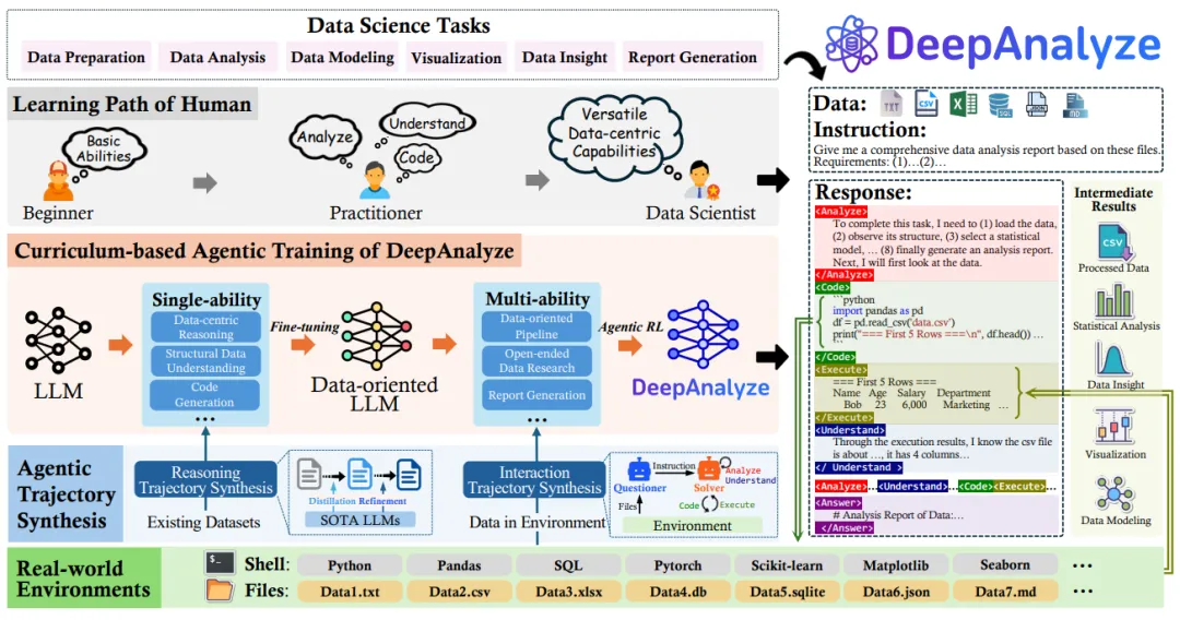 研究团队发现,要解决这些问题,关键在于让模型像人类数据科学家一样在真实环境中学习和成长。人类数据科学家的成长路径是有规律的:从掌握单项技能开始,比如学习编程、理解统计学、掌握数据库操作,然后逐步整合这些能力,最终能够独立完成复杂的数据研究项目。DeepAnalyze正是模仿了这个学习路径,通过"课程式智能体训练"范式,让模型从简单到复杂地逐步掌握数据科学的各项能力。