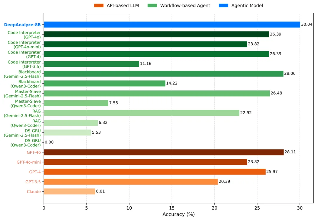 A:DeepAnalyze-8B的根本区别在于它是一个经过智能体训练的模型,而不是基于预定义工作流程的系统。传统工具和基于GPT的智能体通常依赖人工设计的固定流程,遇到预料之外的情况时无法灵活应对。DeepAnalyze则通过在真实数据环境中的强化学习,学会了自主编排行动和根据反馈优化策略的能力。它能够处理从简单问答到完全开放式研究的各种任务,而无需为每种任务设计专门的工作流程。此外,DeepAnalyze只有80亿参数,却能在多个基准测试上超越基于GPT-4o等大型模型构建的系统,证明了智能体训练范式的效率优势。