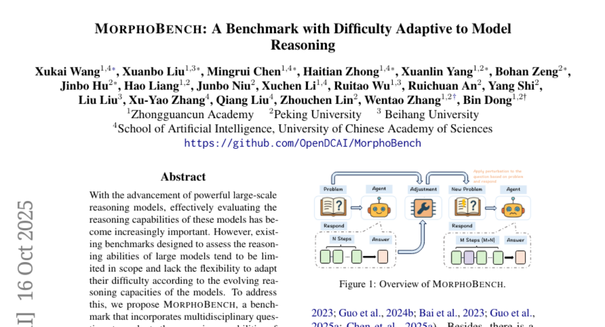 2025年1月,由北京大学、中科院、北航等多家顶尖科研院所组成的研究团队发表了一项令人瞩目的研究成果。这项名为"MORPHOBENCH: A Benchmark with Difficulty Adaptive to Model Reasoning"的研究由王旭凯、刘宣博、陈明睿等多位研究者联合完成,论文编号为arXiv:2510.14265v1。研究团队开发出了一个革命性的AI评测工具,就像给人工智能配备了一位"智能考官",能够根据不同AI模型的能力水平自动调整考试难度。