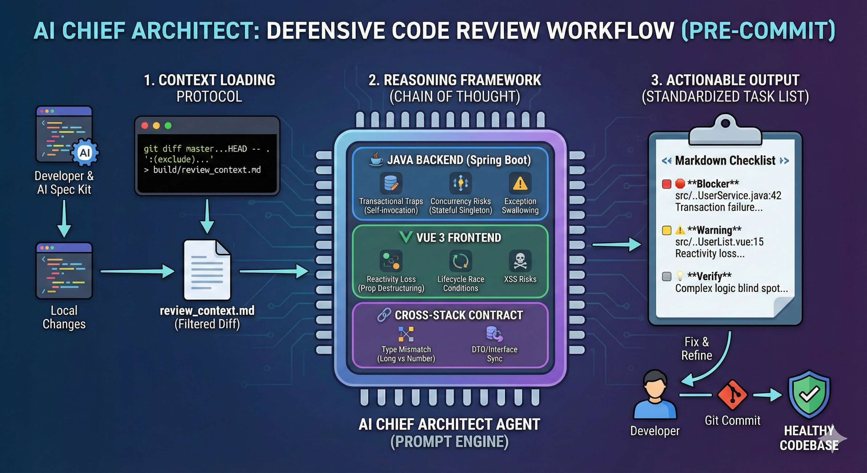 本文将探讨一种基于 Prompt Engineering 的高阶实践:如何将 AI 设定为精通 Java Spring Boot 和 Vue 3 的首席全栈架构师,构建一套自动化的防御性审查工作流。