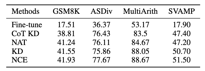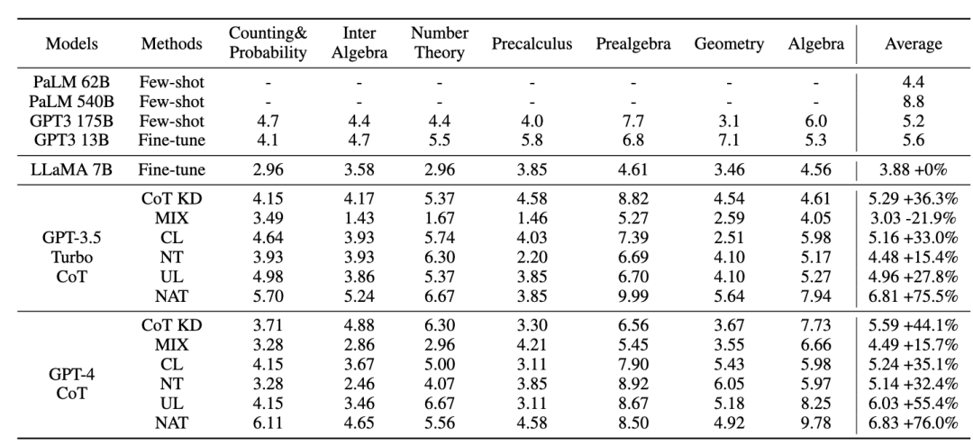 从 GPT3 和 PaLM 的低值可以看出,MATH 是一个非常困难的数学数据集,但 NAT 仍然能够在参数极少的情况下表现突出。与在原始数据上进行微调相比,NAT 在两种不同的 CoT 来源下实现了约 75.75% 的提升。与 CoT KD 在正样本上的比较,NAT 也显著提高了准确性,展示了负样本的价值。