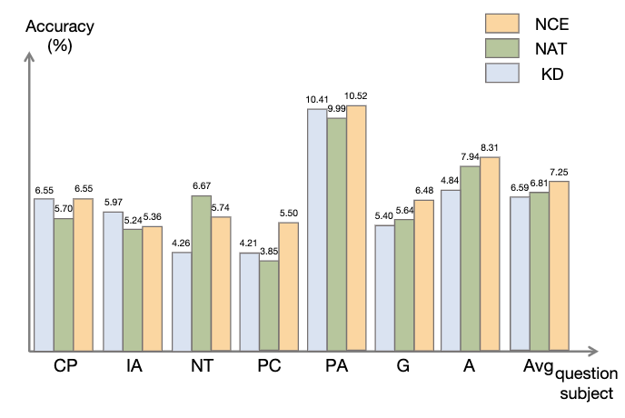 如图所示,与知识蒸馏(KD)相比,NCE 实现了平均 10%(0.66) 的进步,这证明了利用负样本提供的校准信息进行蒸馏的有效性。与 NAT 相比,尽管 NCE 减少了一些参数,但它依然有 6.5% 的进步,实现压缩模型并提高性能的目的。