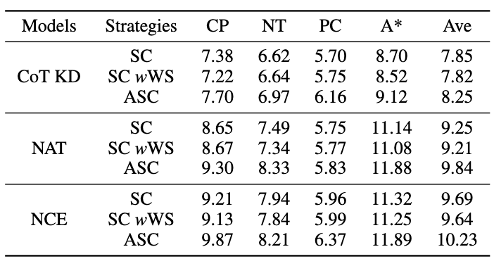 从知识迁移的角度来看,ASC 实现了对来自 LLMs 的知识(正向和负向)的进一步利用,以帮助小模型获得更好的性能。