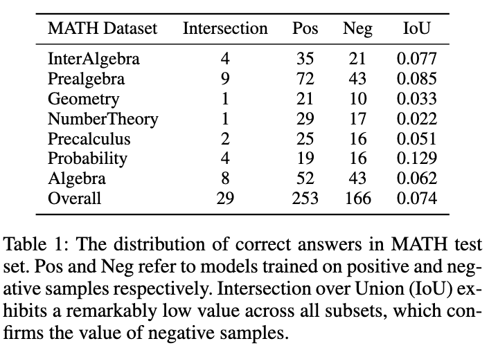 如图所示,表 1 展示了一个有趣的现象:分别在正、负样本数据上训练的模型,在 MATH 测试集上的准确答案重叠非常小。尽管负样本训练的模型准确性较低,但它能够解决一些正样本模型无法正确回答的问题,这证实了负样本中包含着宝贵的知识。此外,负样本中的错误链路能够帮助模型避免犯类似错误。另一个我们应该利用负样本的原因是 OpenAI 基于 token 的定价策略。即使是 GPT-4,在 MATH 数据集上的准确性也低于 50%,这意味着如果仅利用正样本知识,大量的 token 会被浪费。因此,我们提出:相比于直接丢弃负样本,更好的方式是从中提取和利用有价值的知识,以增强小模型的专业化。