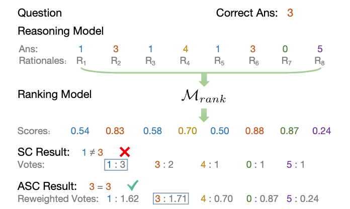 - 除了训练阶段,我们还在推理过程中利用负向信息。传统的自洽性方法将相等或基于概率的权重分配给所有候选输出,导致投票出一些不可靠的答案。为了缓解该问题,提出了动态自洽性(ASC)方法,在投票前进行排序,其中排序模型在正负样本上进行训练的。