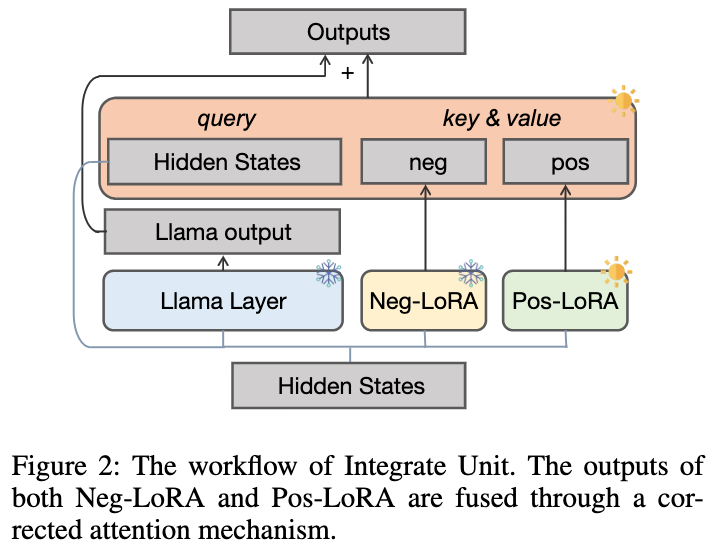 我们冻结 θ 以防止内部知识被遗忘,并额外引入正 LoRA 模块 θ 。理想情况下,我们应该正向集成正负 LoRA 模块(在每个 LLaMA 层中输出表示为 与 ),以补充正样本中所缺乏但对应 所具有的有益知识。当 θ 包含有害知识时,我们应该对正负 LoRA 模块进行负向集成,以帮助减少正样本中可能的不良行为。