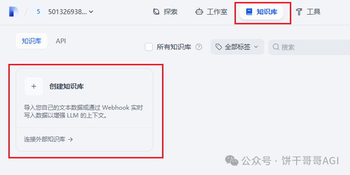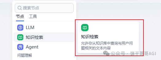 回到我们的工作流,在开始的之后,新建一个知识检索,也就是说,在用户对话的时候,就根据用户的需求,提前先到知识库里找好需要用到的表结构,喂给AI。