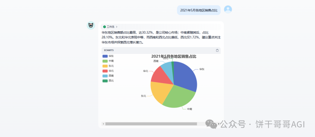 给定一个查询需求后,AI会到知识库查询表结构,并据此生成SQL语句,执行后,调用Echarts图表的能力,以及数据科学家的Agent,最终生成一个图文并茂的可视化查询结果。