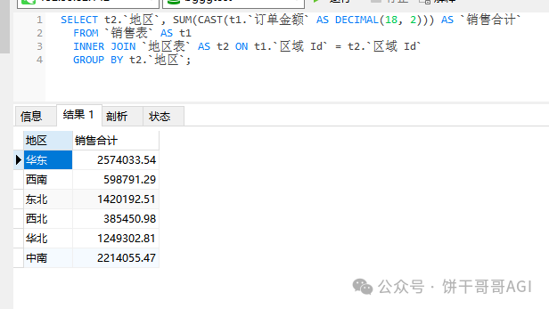 { "text":"","files":[],"json":[ { "result":[ { "地区":"华东", "销售合计":"2574033.54" }, { "地区":"西南", "销售合计":"598791.29" }, { "地区":"东北", "销售合计":"1420192.51" } ] }]}