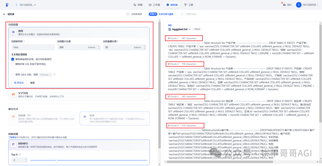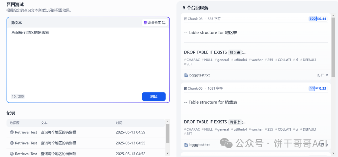 - 检索设置中的 Top K 可以根据数据复杂程度选高一点,正常来说一次查询最多就3-5个表做连接。如果再多的话,或许就不太适合用AI 了。