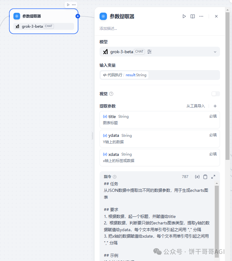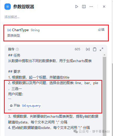 还记得我们的参数提取器吗,它本身就是一个AI的运行逻辑,所以我们可以在里面新增一个ChartType的参数,同时在指令里也给出对应的要求和示例,如下图: