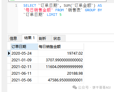 { "text": "SELECT `订单日期`, SUM(`订单金额`) AS '每日销售金额' FROM `销售表` GROUP BY `订单日期` LIMIT 5","files": [],"json": []}{"text": "","files": [],"json": [ { "result": [ { "每日销售金额": 19747.02, "订单日期": "2020-05-24" }, { "每日销售金额": 3707.9900000000002, "订单日期": "2021-01-09" }, { "每日销售金额": 11604.099999999999, "订单日期": "2021-02-11" }, { "每日销售金额": 20188.98, "订单日期": "2021-06-11" }, { "每日销售金额": 47586.95000000001, "订单日期": "2021-05-06" } ] } ]}