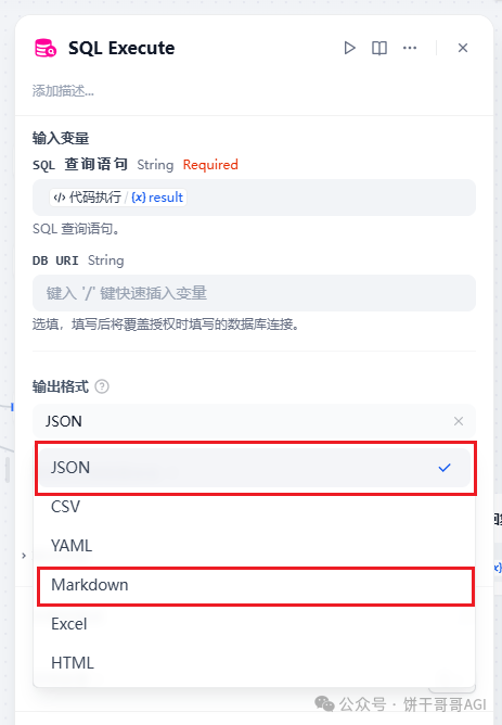 首先要调整一个地方,就是SQL Execute这个节点是可以定义输出格式的,原先我们一直用的是Markdown,好处是在最后的对话中能直接呈现表格,但不利于我们解析数据。要改成JSON
