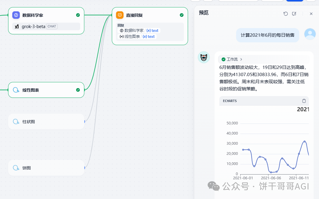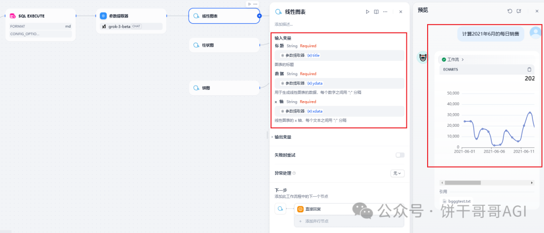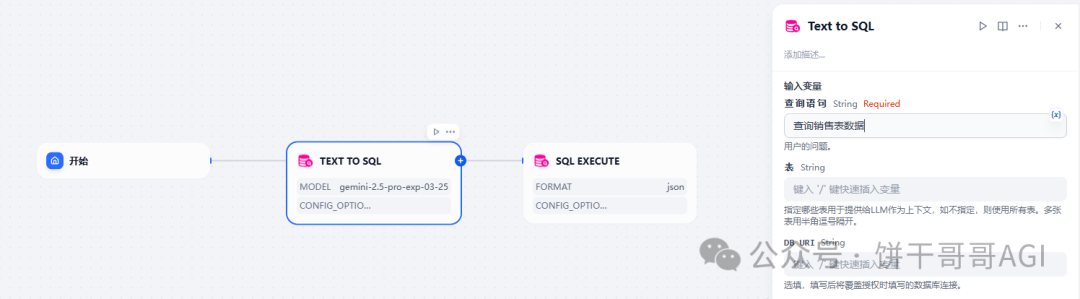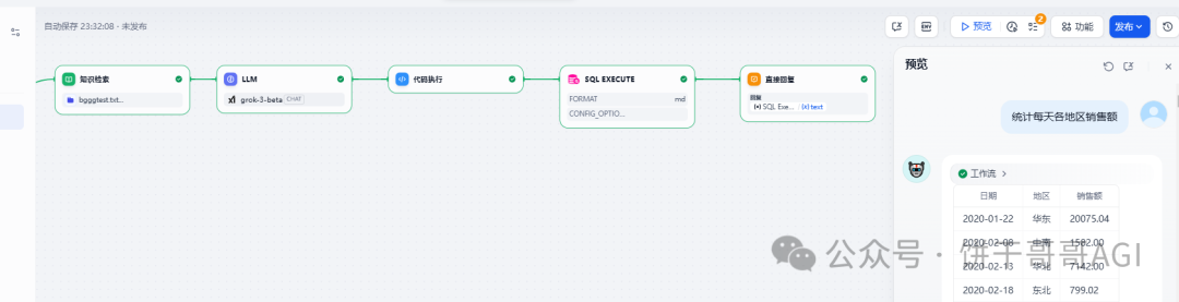 目前的工作流和对话效果如图所示,也就完成了我们第一个模块:text2SQL