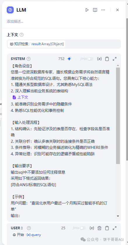 此时,因为我们需要用到知识检索的结果,就要用用LLM大模型节点来生成,只需要设置好提示词,以及把检索到 的表结构通过上下文的形式放进去即可: