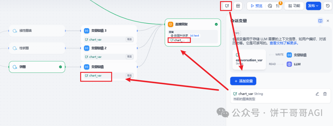 最后,为了让AI回复部分用同样的参数,我们需要新增一个会话变量chart_var