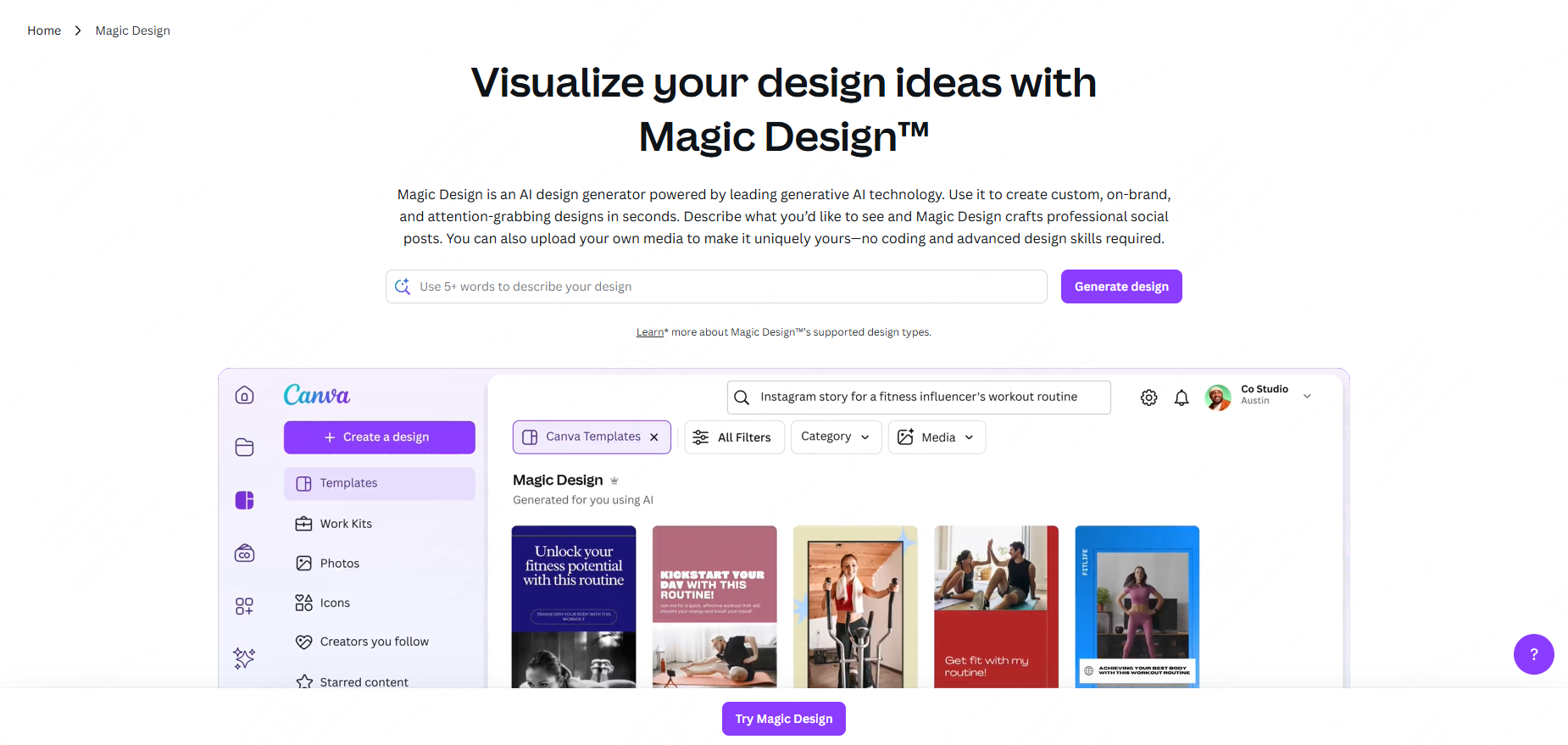 优点: 网页端操作很顺滑,做出来的东西像网页一样现代。它“一键生成”的速度很快,模板也很新潮。