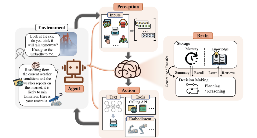 感知:能从环境(物理世界、数据库、网络、用户输入等)获取信息。