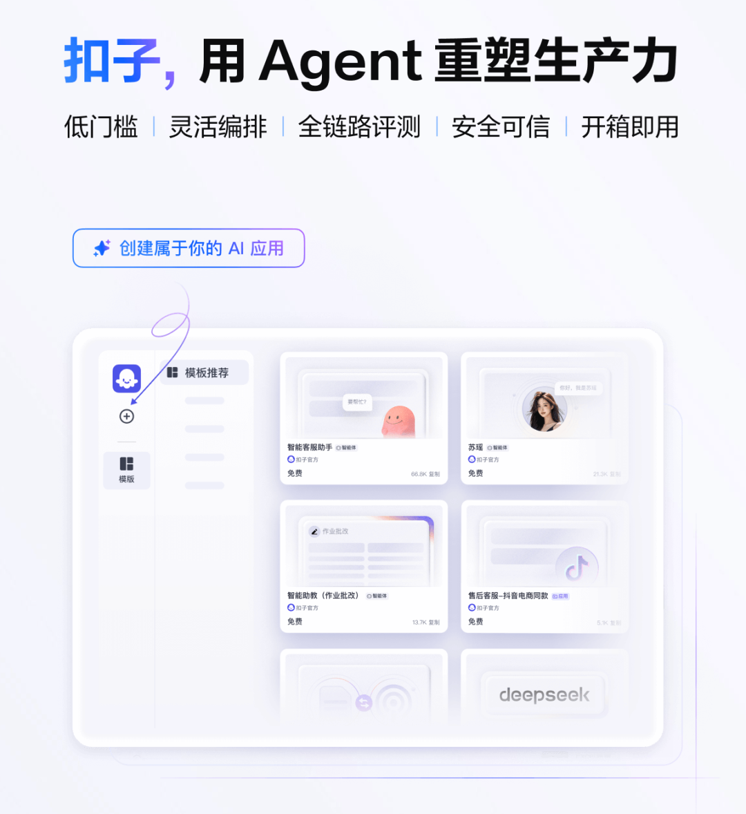 Coze的优势正如它的官网所示:用 Agent 重塑生产力,具有低门槛、灵活编排、全链路评测、安全可信、开箱即用五大能力。