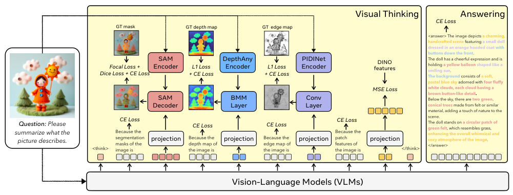 模型在回答问题之前,会先在潜在空间里生成这些视觉Token,相当于在回答有几只羊之前,先在脑海里把每只羊的位置圈出来,确认了空间关系,然后再生成最终的文本答案。