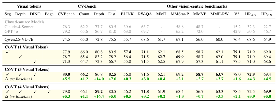 在CV-Bench这个专注于视觉感知的基准测试中,CoVT的表现令人瞩目。
