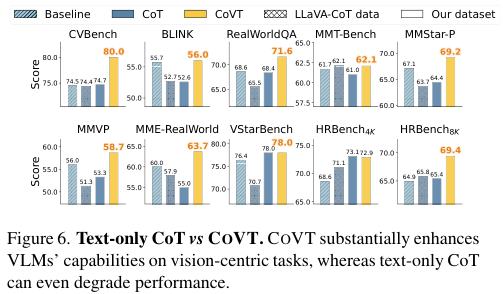 在CV-Bench和BLINK等测试中,使用纯文本CoT的性能经常不如直接回答,甚至出现了显著的倒退。