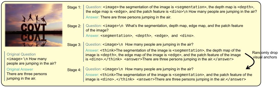 这是质变的一步。引入了视觉思维链格式,模型被要求在 <think> 标签内使用视觉Token进行推理,并必须依据这些视觉线索推导出最终答案。