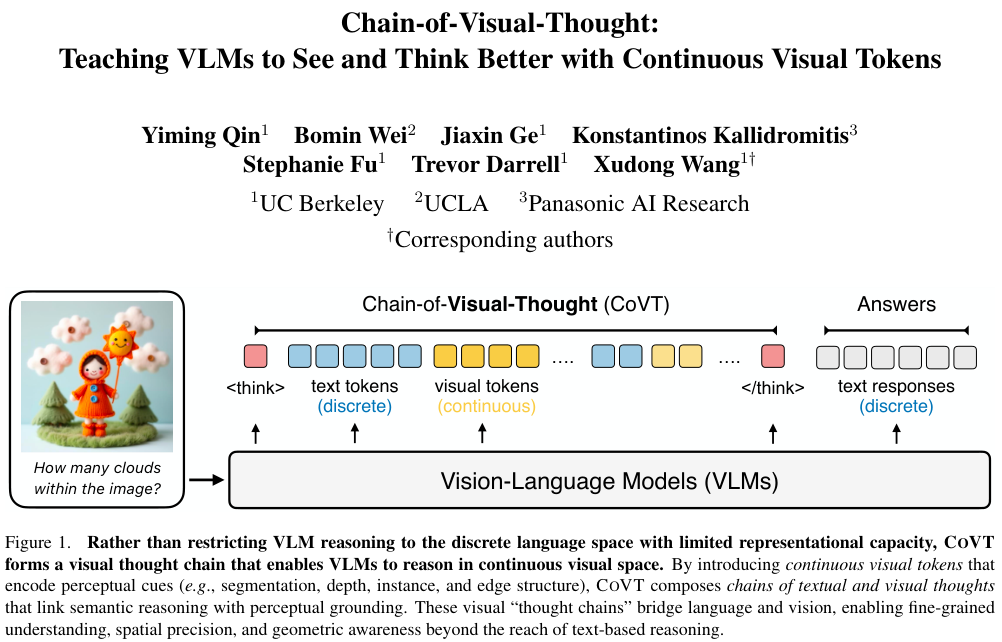 加州大学伯克利分校、加州大学洛杉矶分校(UCLA)与松下AI研究中心的团队联合提出了一种全新的架构——视觉思维链(Chain-of-Visual-Thought,简称CoVT)。