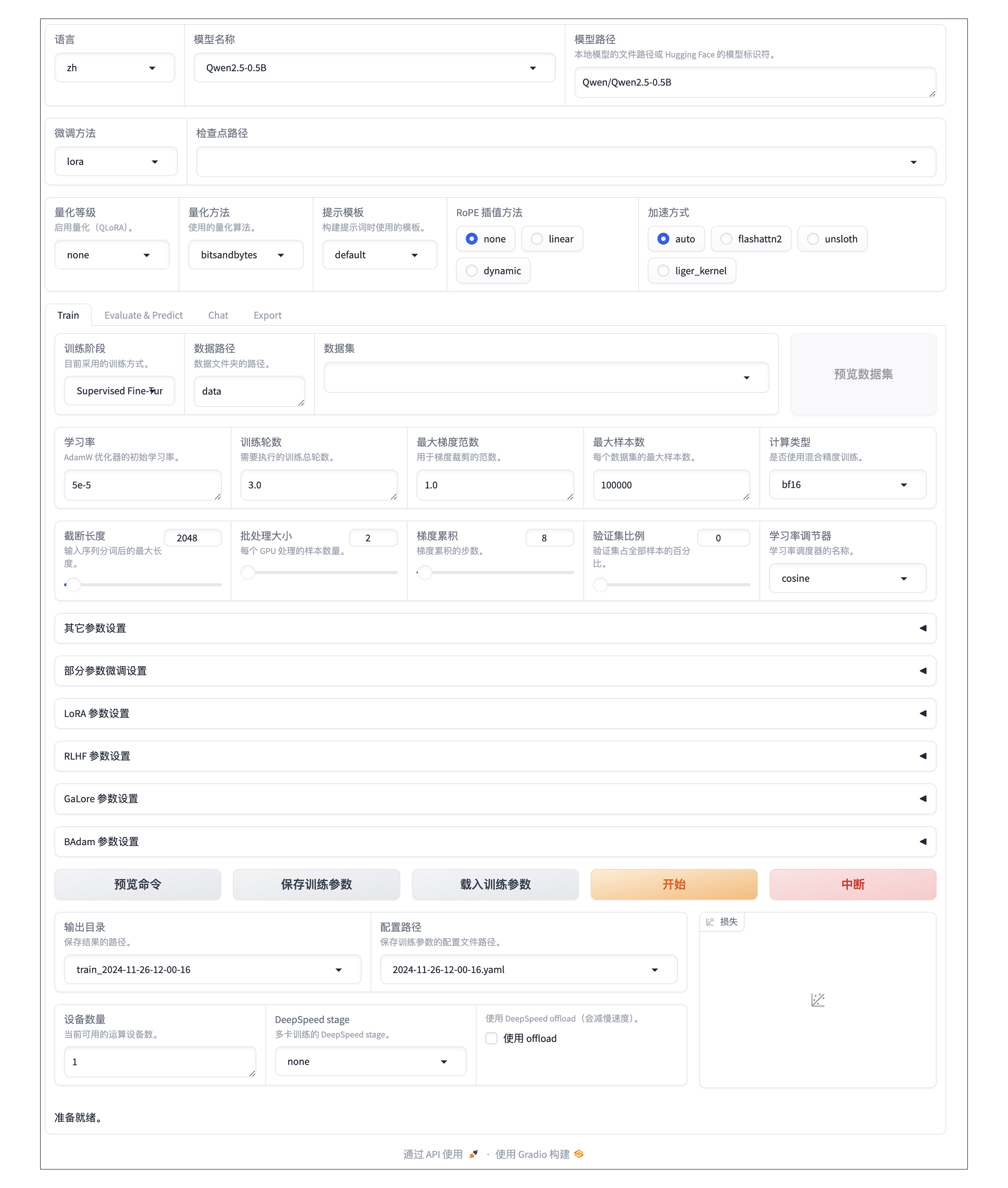 准备好数据,我们就可以开始训练了。前面说了,LLaMa Factory 对新手最友好的地方是它提供了图形化界面,我们可以通过下面的命令,启动图形化界面。
