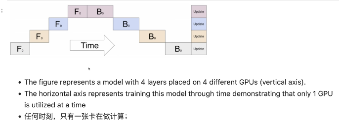 模型并行:当一张卡无法放下一整个模型时,使用多个卡,每张卡存模型的不同层,每张卡计算完后交给下一张卡,实际上一个片段内只有一张卡在跑,其他卡在等待