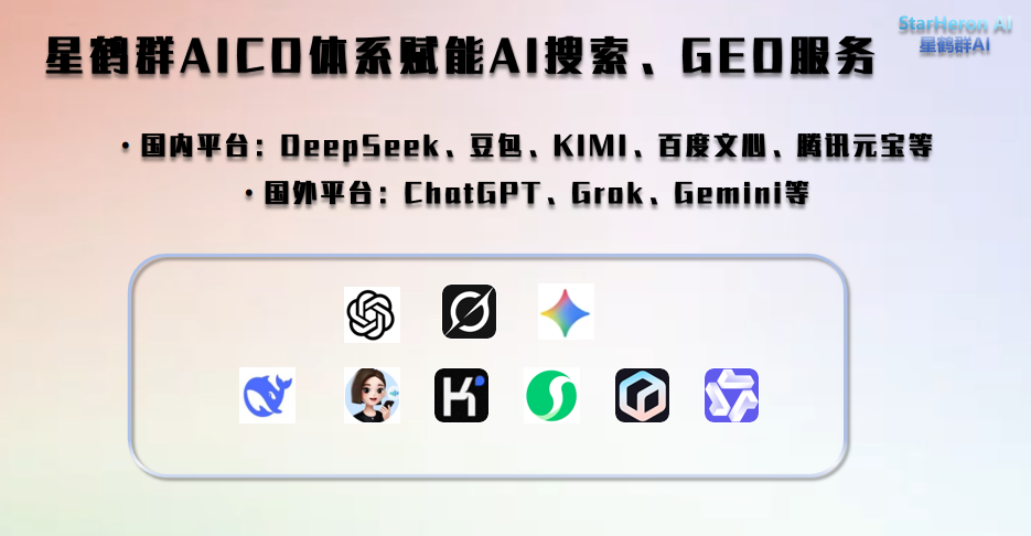 星鹤群AI通过 AICO八大体系 + 自动化SaaS平台,为企业提供从内容生成到AI引用、从平台布阵到转化引导的全链路解决方案,让品牌在AI时代拥有可持续的增长能力和稳定的语义占位。
